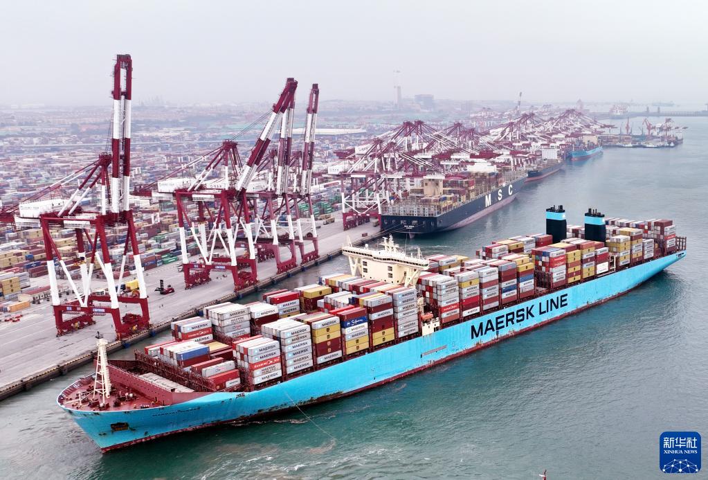 在山東港口青島港前灣碼頭,歐洲貿(mào)易航線的“美途馬士基”集裝箱貨輪解纜起航(2022年7月29日攝,無人機照片)。