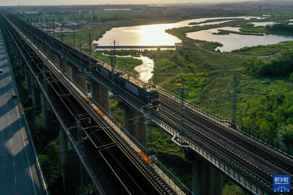 重載列車行駛在大秦鐵路上(2022年7月16日攝,無人機照片)。為做好迎峰度夏能源保供工作,中國鐵路太原局集團(tuán)有限公司在確保運輸安全的前提下全力提升煤炭運量。