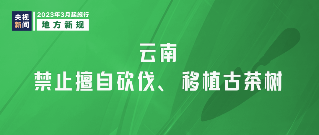 《云南省古茶樹保護條例》3月1日起實施,加強對樹齡在100年以上野生茶樹和栽培型茶樹進行保護?!稐l例》禁止擅自砍伐、移植古茶樹;在古茶樹保護范圍內(nèi)使用危害古茶樹的生長調(diào)節(jié)劑、化學除草劑等。