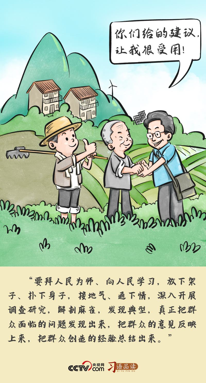 人民是最好的老師,基層是最大的課堂?!邦I(lǐng)導干部進行調(diào)查研究,要放下架子、撲下身子,深入田間地頭和廠礦車間,同群眾一起討論問題,傾聽他們的呼聲,體察他們的情緒,感受他們的疾苦,總結(jié)他們的經(jīng)驗,吸取他們的智慧?!卑萑嗣駷閹?,習近平以言傳身教的方式作出表率。