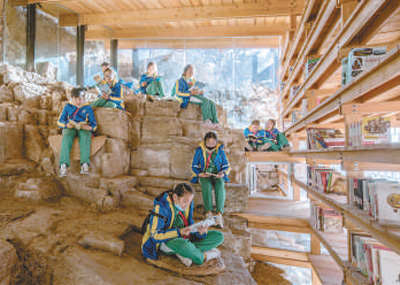 羅宇杰把書屋選址在了浙水村東的浙水河前。整座書屋依山而建,室內(nèi)沒有書桌、凳子,而是利用巖石本身的梯度,打磨之后成為閱覽區(qū)。白天,陽光穿過玻璃,人們能夠在陽光下盡情閱讀;到了晚上,室內(nèi)暖黃色的燈光亮起,又成了村內(nèi)一道景觀。