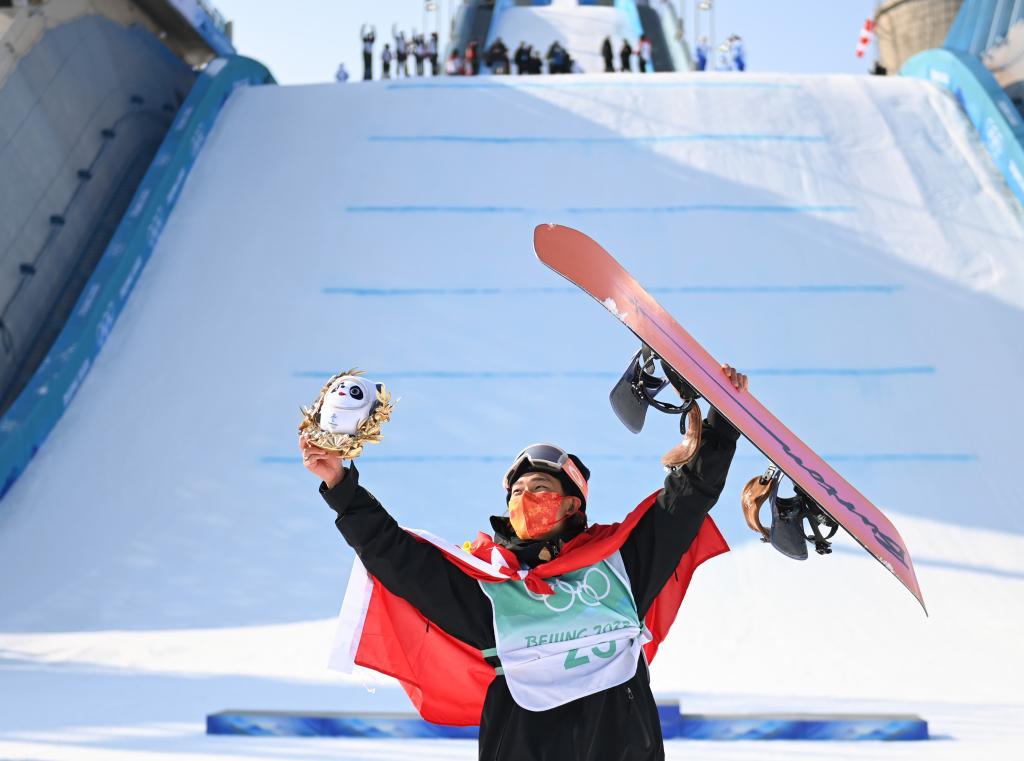 這是2022年2月15日,中國選手蘇翊鳴在北京2022年冬奧會(huì)單板滑雪男子大跳臺(tái)決賽奪冠后慶祝。