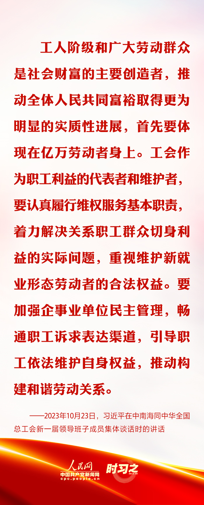 2023年10月23日下午,習近平總書記在中南海同中華全國總工會新一屆領導班子成員集體談話并發(fā)表重要講話。他強調,工會作為職工利益的代表者和維護者,要認真履行維權服務基本職責,著力解決關系職工群眾切身利益的實際問題,重視維護新就業(yè)形態(tài)勞動者的合法權益。