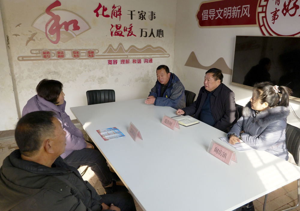 在寶豐縣鬧店鎮(zhèn)范營村“擺理堂”,村鎮(zhèn)干部(右)為村民進(jìn)行信訪調(diào)解(2023年12月20日攝)。河南省寶豐縣積極推進(jìn)四下基層工作深入開展,已打造鬧店鎮(zhèn)范營村“擺理堂”、石橋鎮(zhèn)東大莊村“老娘舅茶室”等系列鄉(xiāng)村社區(qū)服務(wù)陣地,協(xié)調(diào)鄰里關(guān)系,有效化解各類矛盾,同時不斷豐富工作內(nèi)容,拓展服務(wù)功能,助力鄉(xiāng)村振興。
