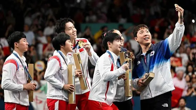 △巴黎奧運(yùn)會(huì)乒乓球混合雙打頒獎(jiǎng)儀式結(jié)束后,中朝韓運(yùn)動(dòng)員聚到一起合影的場景,在朋友圈刷了屏。