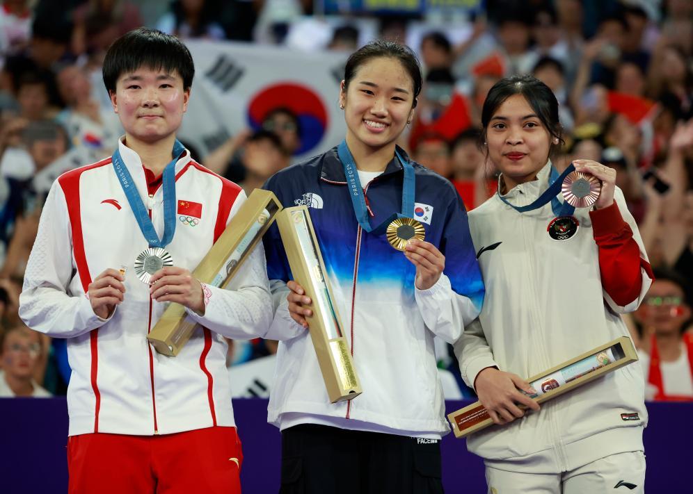 △8月5日,羽毛球女單冠軍韓國選手安洗瑩(中)、亞軍中國選手何冰嬌(左)、季軍印度尼西亞選手瑪麗斯卡在頒獎(jiǎng)儀式上。