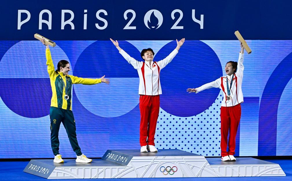 △在巴黎奧運(yùn)會(huì)跳水項(xiàng)目女子3米板決賽中,中國選手陳藝文獲得金牌,中國選手昌雅妮獲得銅牌。